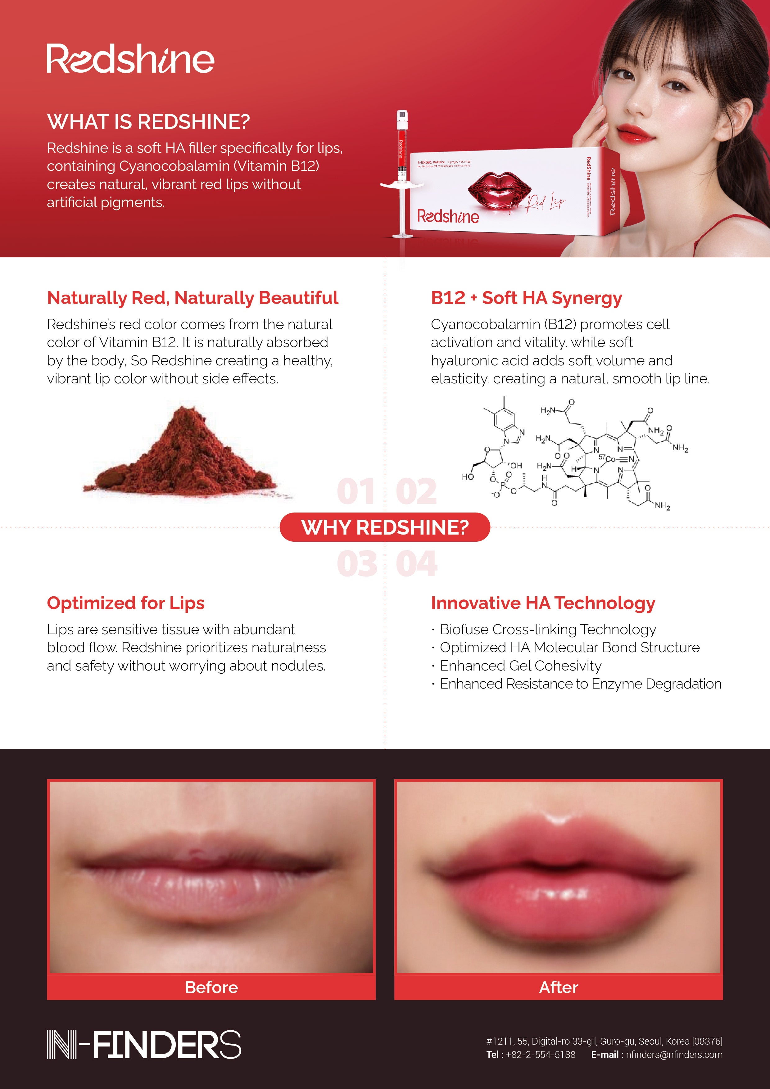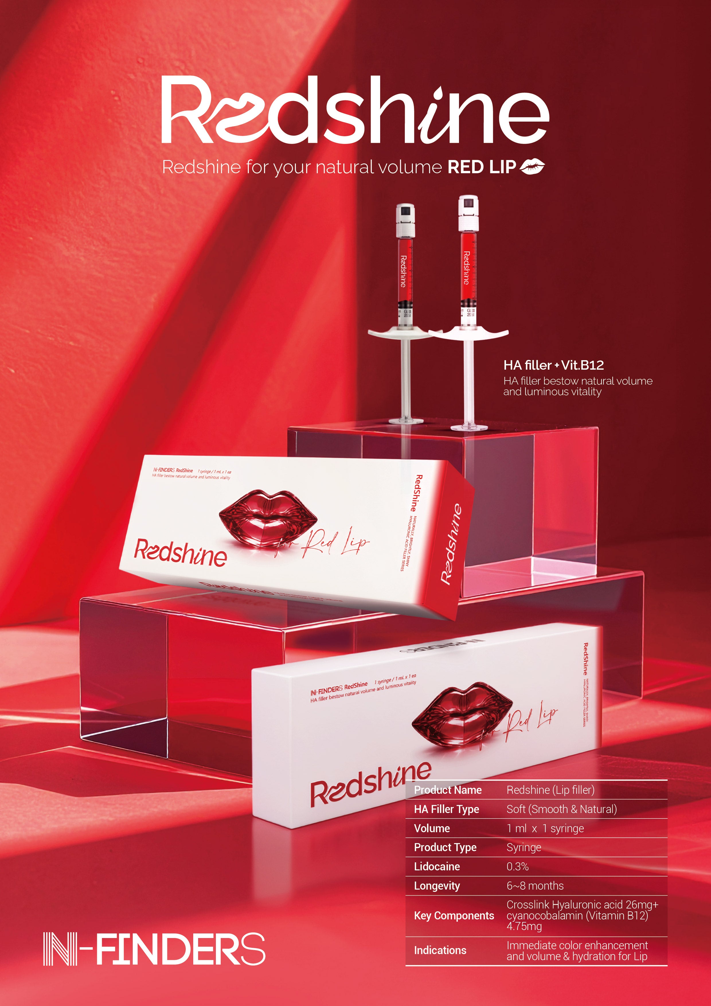 RedShine is a premium lip filler containing Vitamin B12 (cyanocobalamin), which gives it its unique natural red color while enhancing lip vitality and brightness.